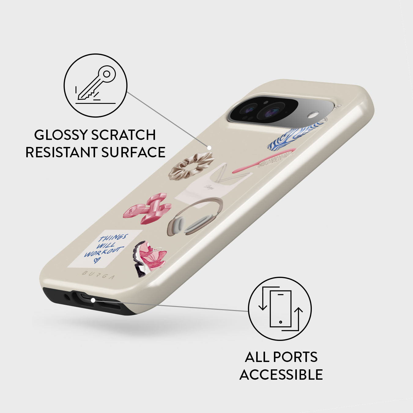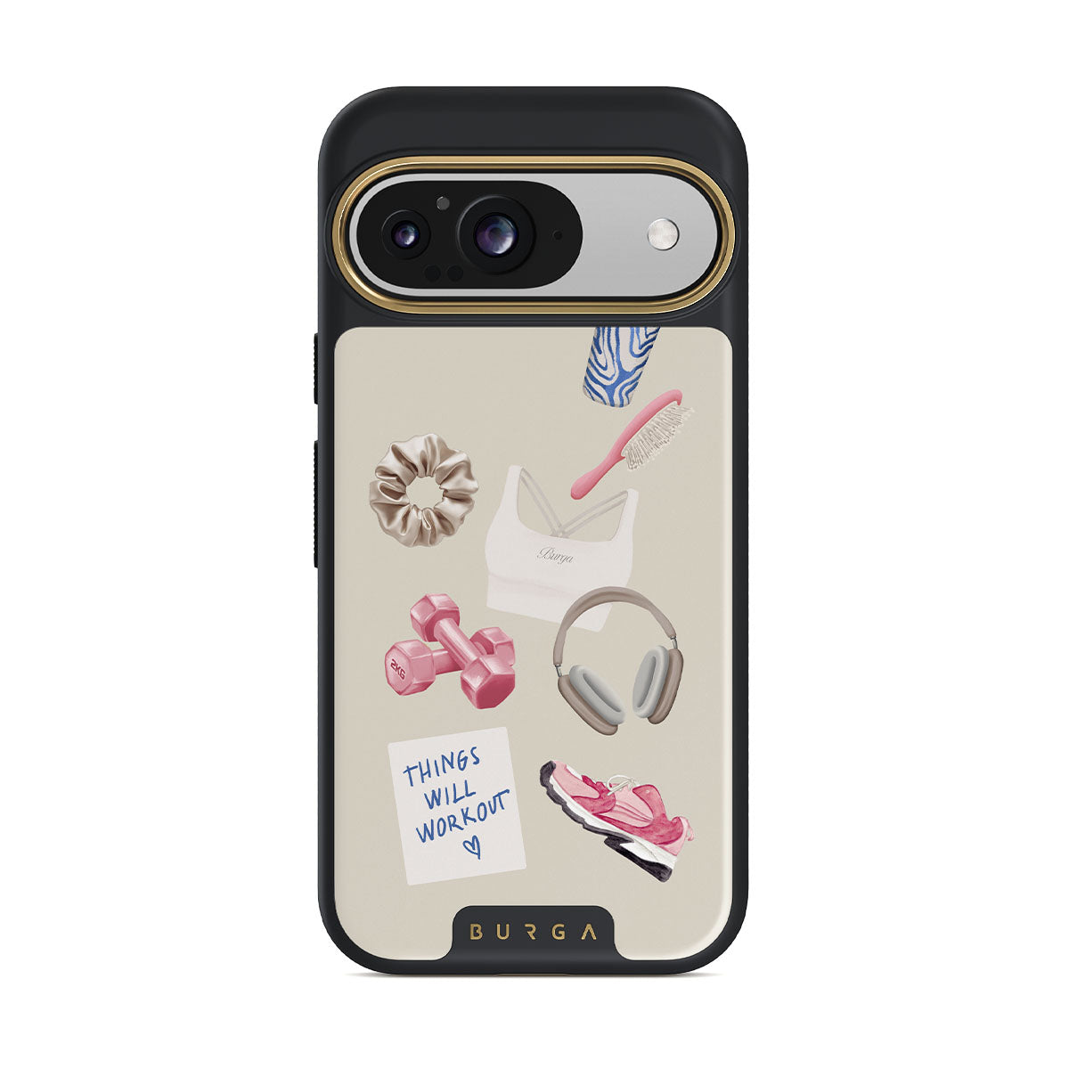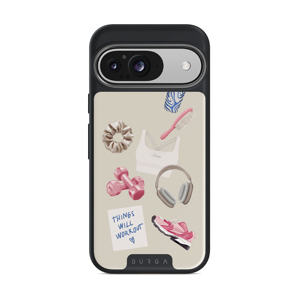 This design features: dumbbells. headphones. tumbler. hairbrush. pink trainers. sports bra. crunchie. Things Will Work Out sticky note