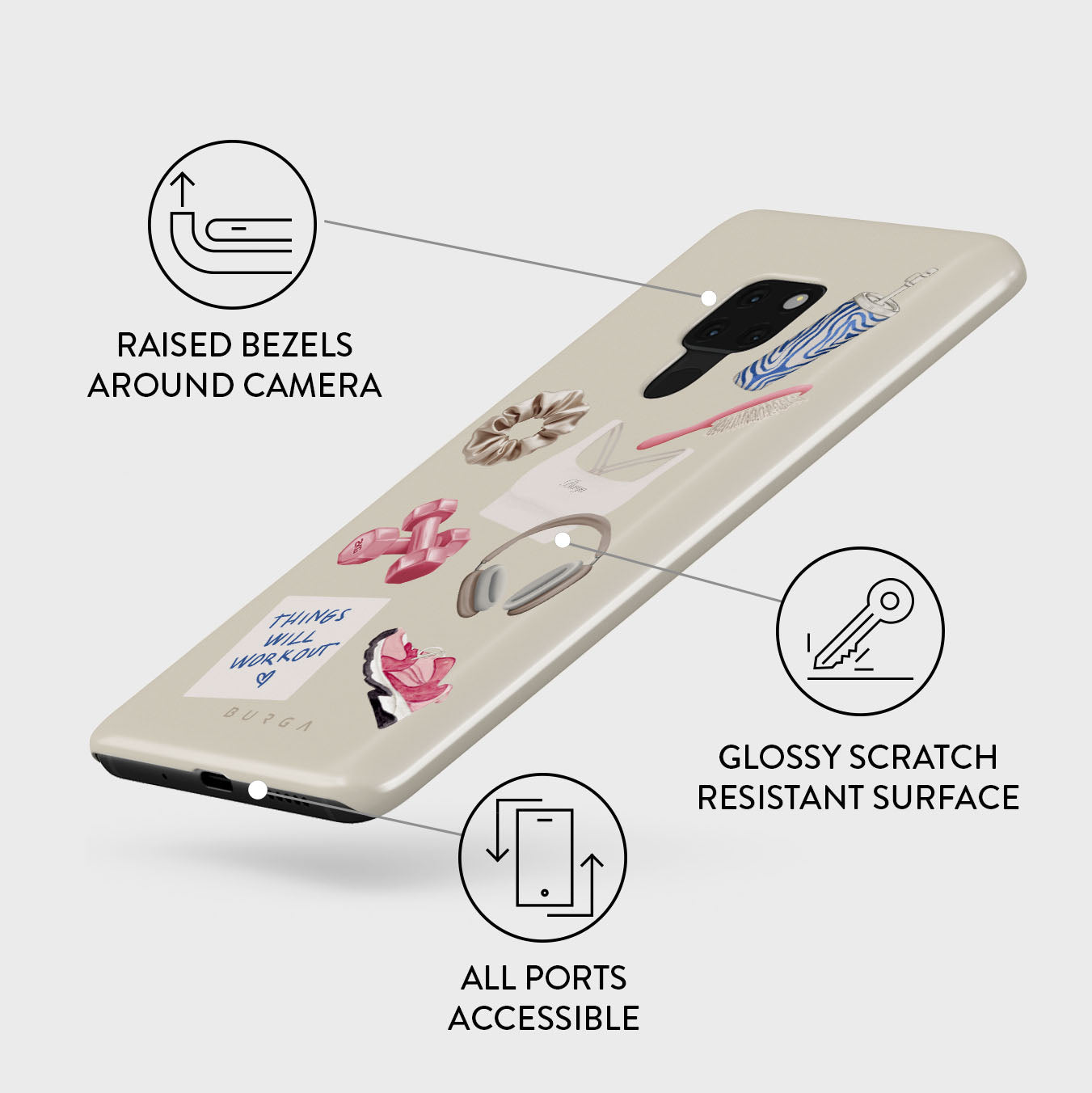This design features: dumbbells. headphones. tumbler. hairbrush. pink trainers. sports bra. crunchie. Things Will Work Out sticky note
