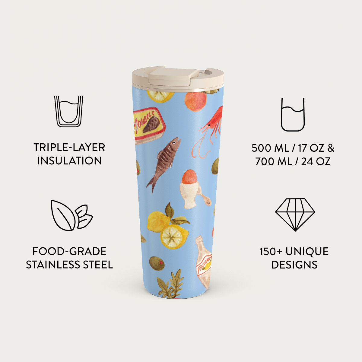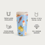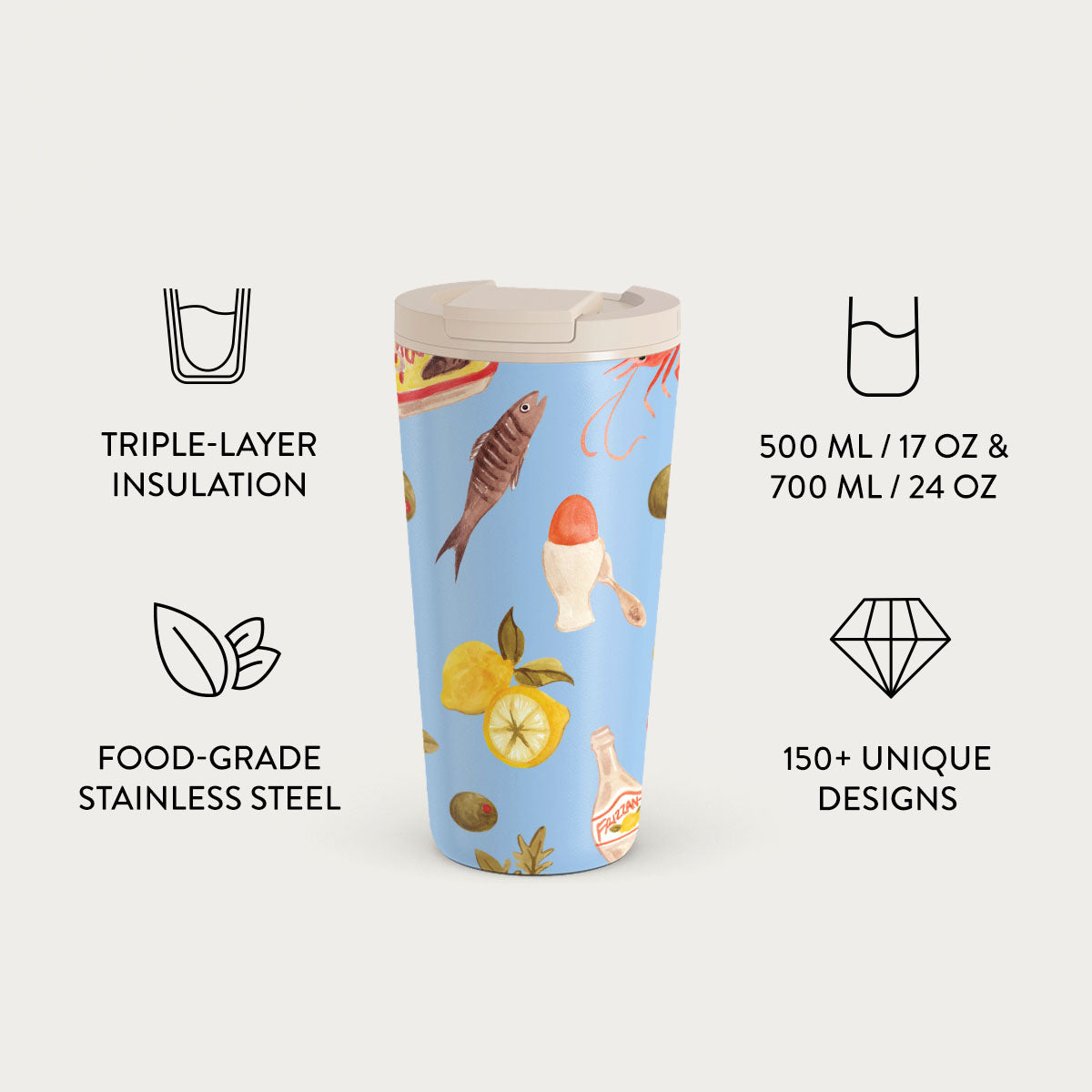 • 500 ml (17 oz.) Travel Mug: Keeps drinks hot for 6 hours. cold for 24 hours.