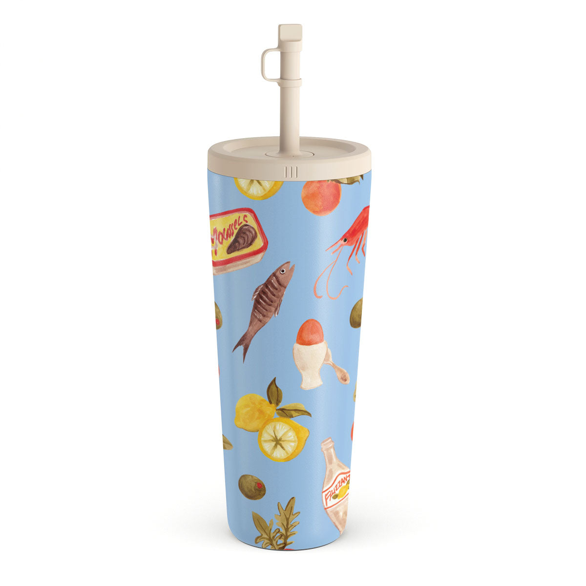 This design features: crayfish. citrus. picnic. lemon. egg. pickles. fresh greenery. beachside elements. peach. flower. olive.