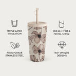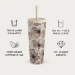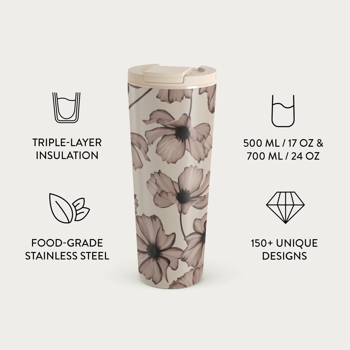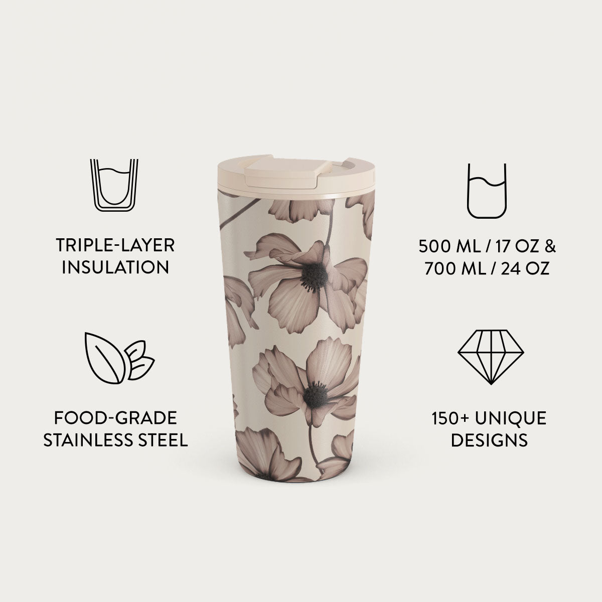 500 ml (17 oz.) Travel Mug: Keeps drinks hot for 6 hours. cold for 24 hours.