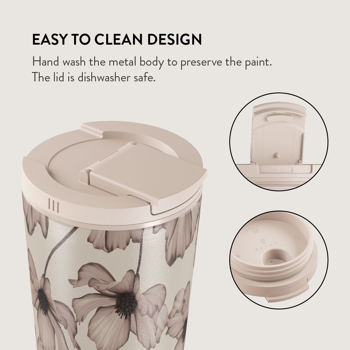 To keep your BURGA travel mug looking vibrant and working flawlessly. hand wash with mild detergent. Avoid abrasive sponges or cleaners. do not put it in the dishwasher or microwave. Avoid prolonged soaking to preserve the color vibrancy.