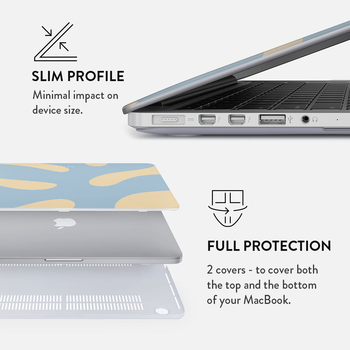 Either way. the BURGA MacBook case is the essential accessory for your everyday portable work-horse. It comes with two separate covers for the top and bottom of your laptop for that 360 protection. Despite this fact. it still maintains a slim profile and doesn’t make your MacBook feel bulky. The bottom cover also has a vent to keep your laptop from overheating when sitting. for example… well… on your lap! What else could you want from a MacBook cover? That’s right – easily accessible ports. Got that covered (or rather. NOT covered) as well.
