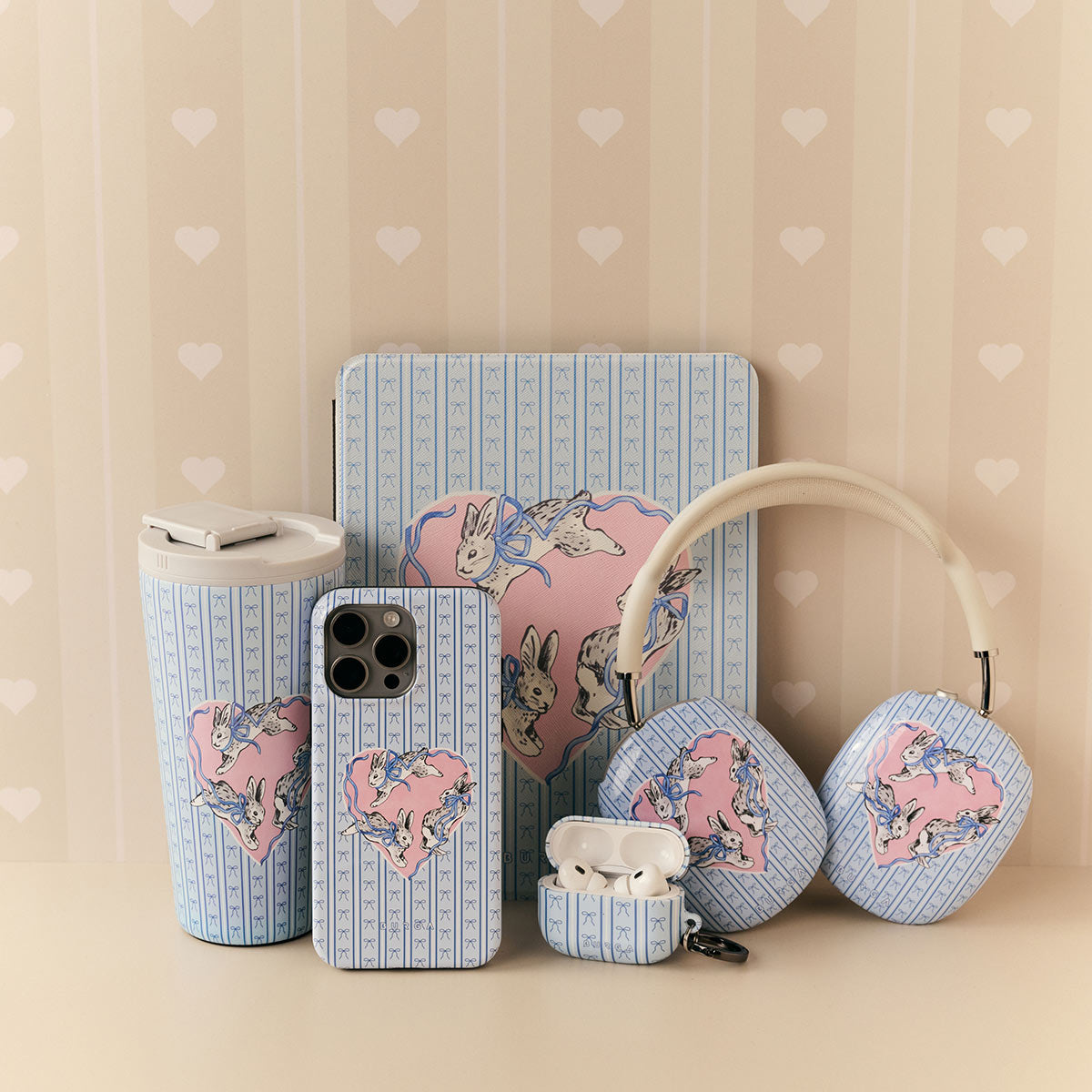 This design features: white rabbits. heart frame. blue stripes