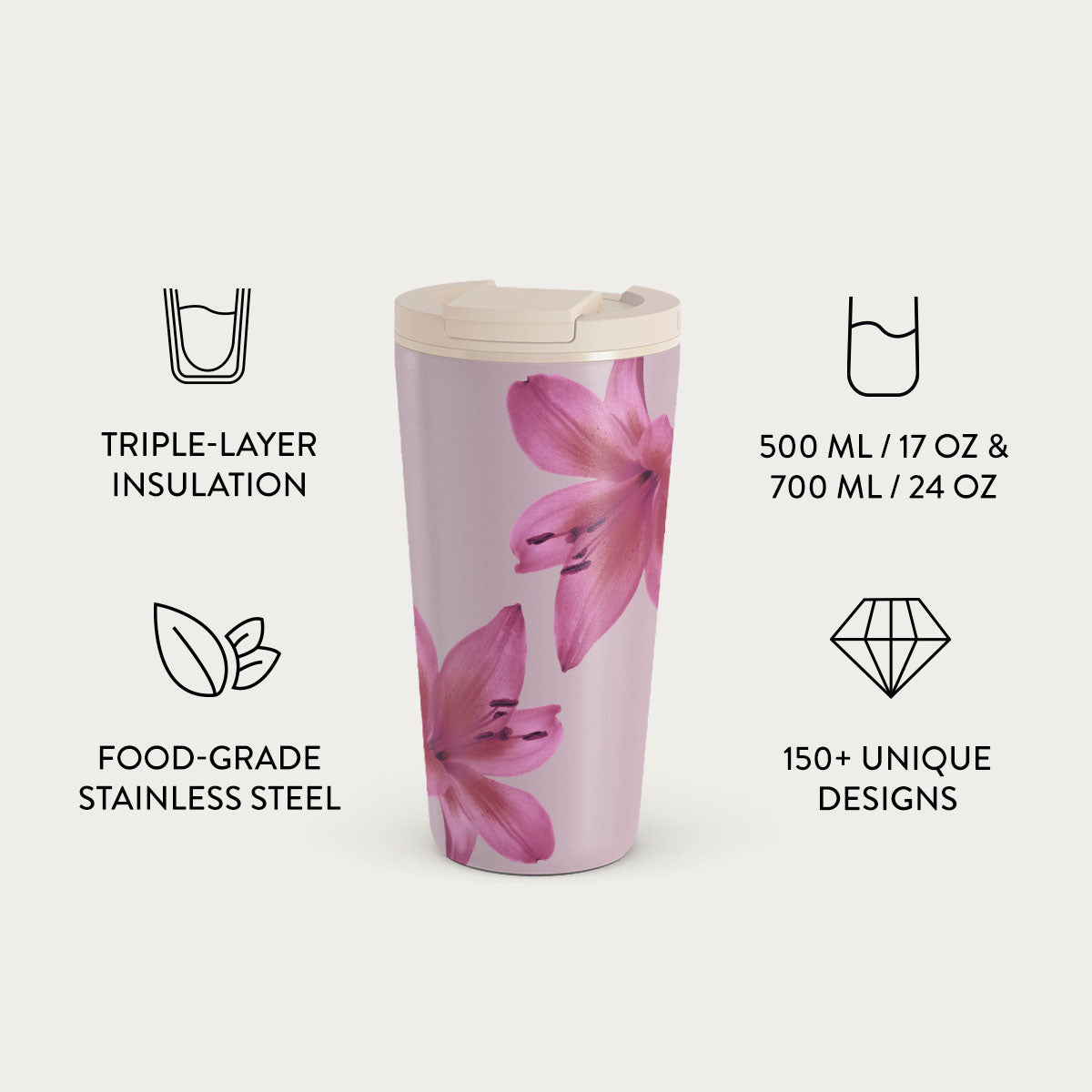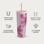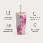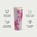 • 500 ml (17 oz.) Travel Mug: Keeps drinks hot for 6 hours. cold for 24 hours.