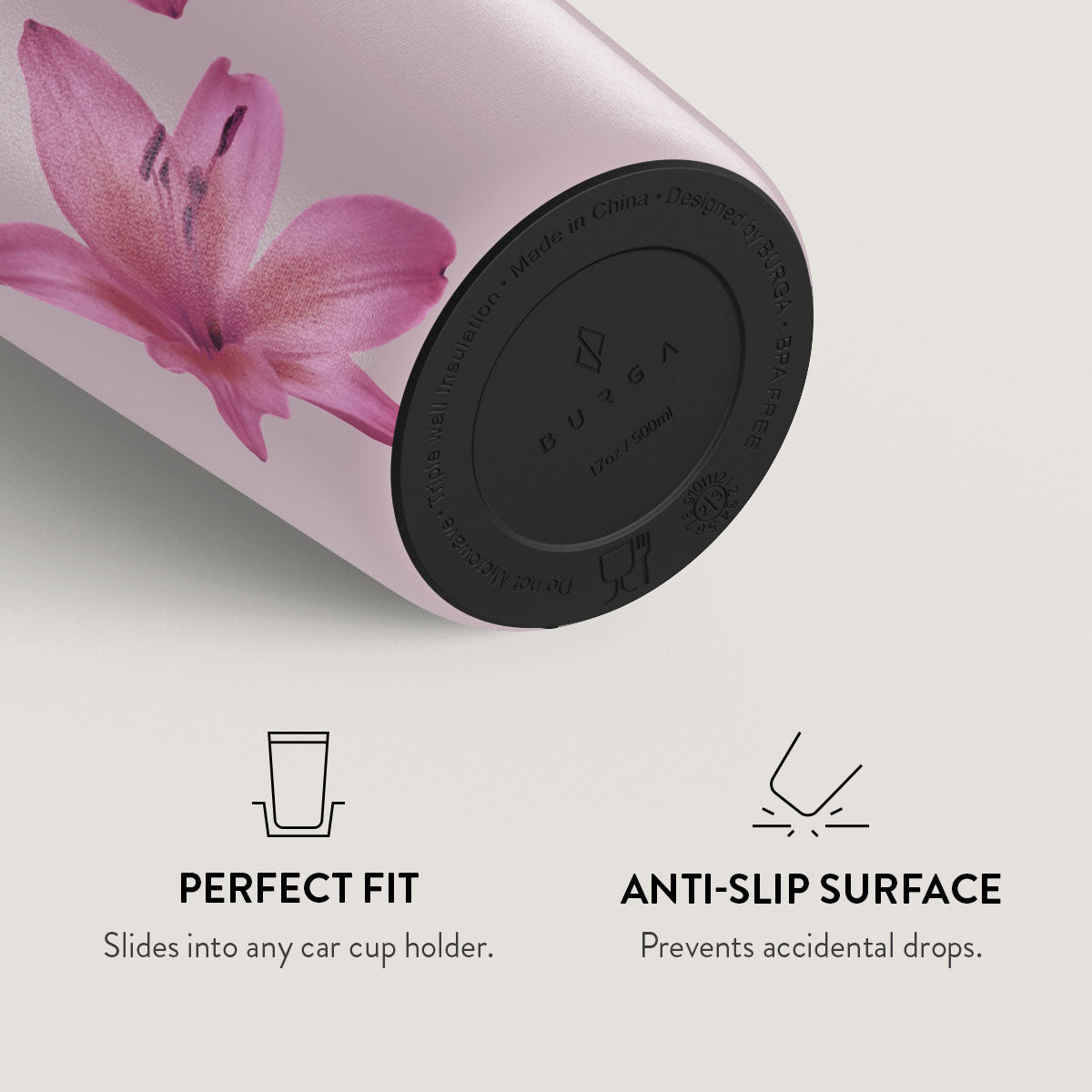 Choose from over 150 unique BURGA designs. each paired with one of six vibrant flap or straw lid colors. Our team matches the lid to the design for a seamless and stylish look.