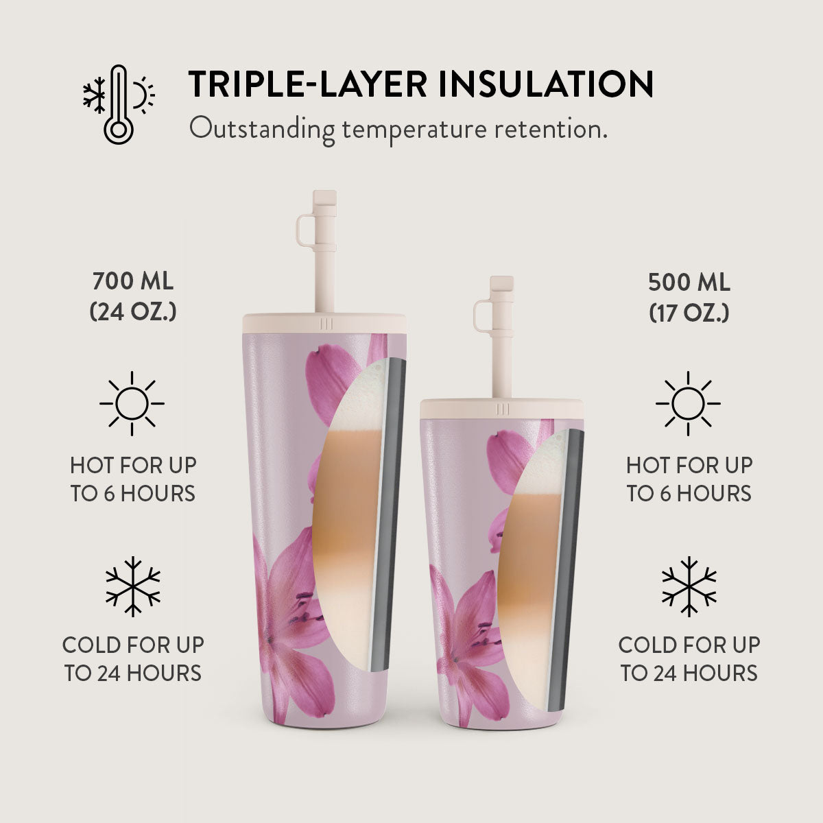 • 700 ml (24 oz.)Travel Mug: Keeps drinks hot for 6 hours. cold for 24 hours.