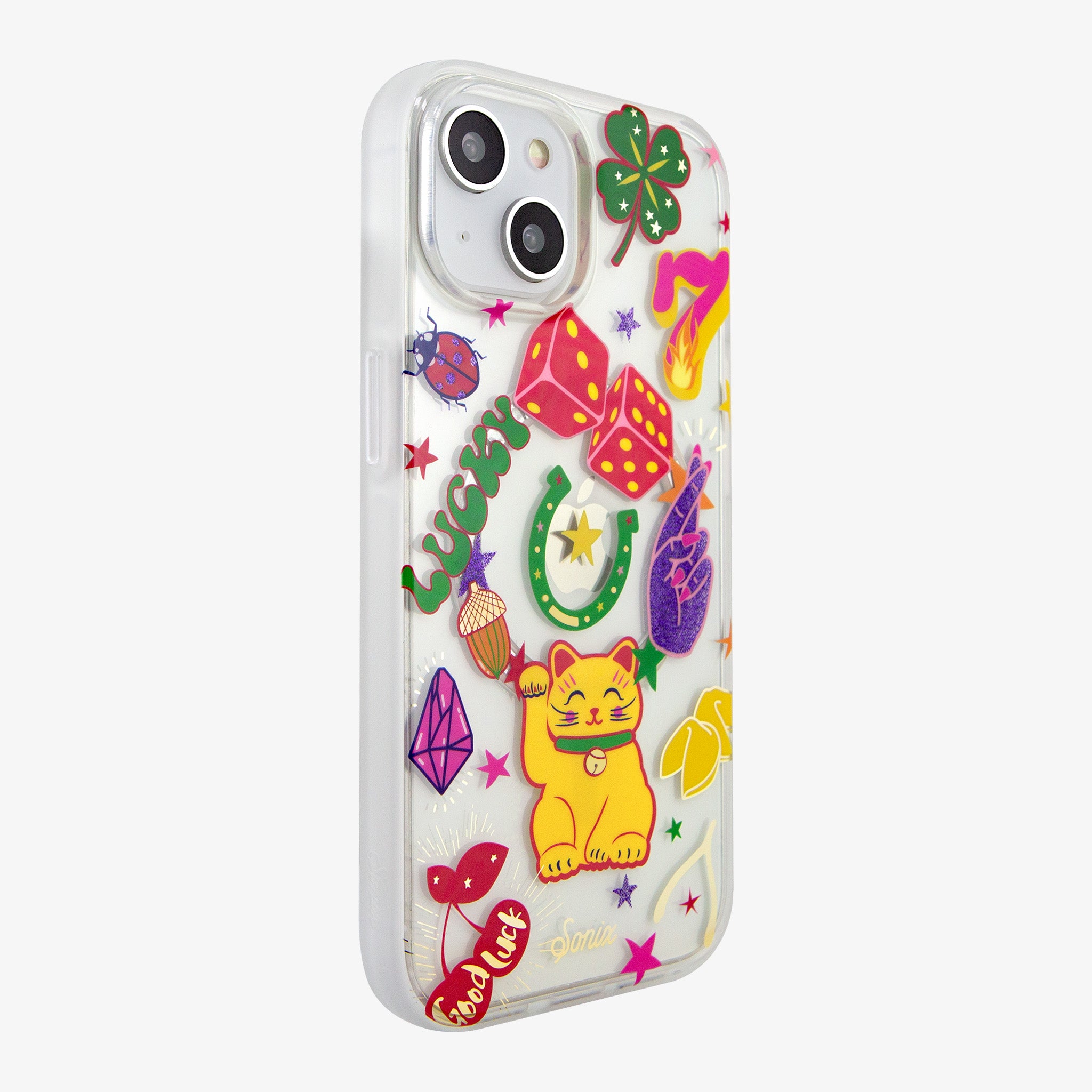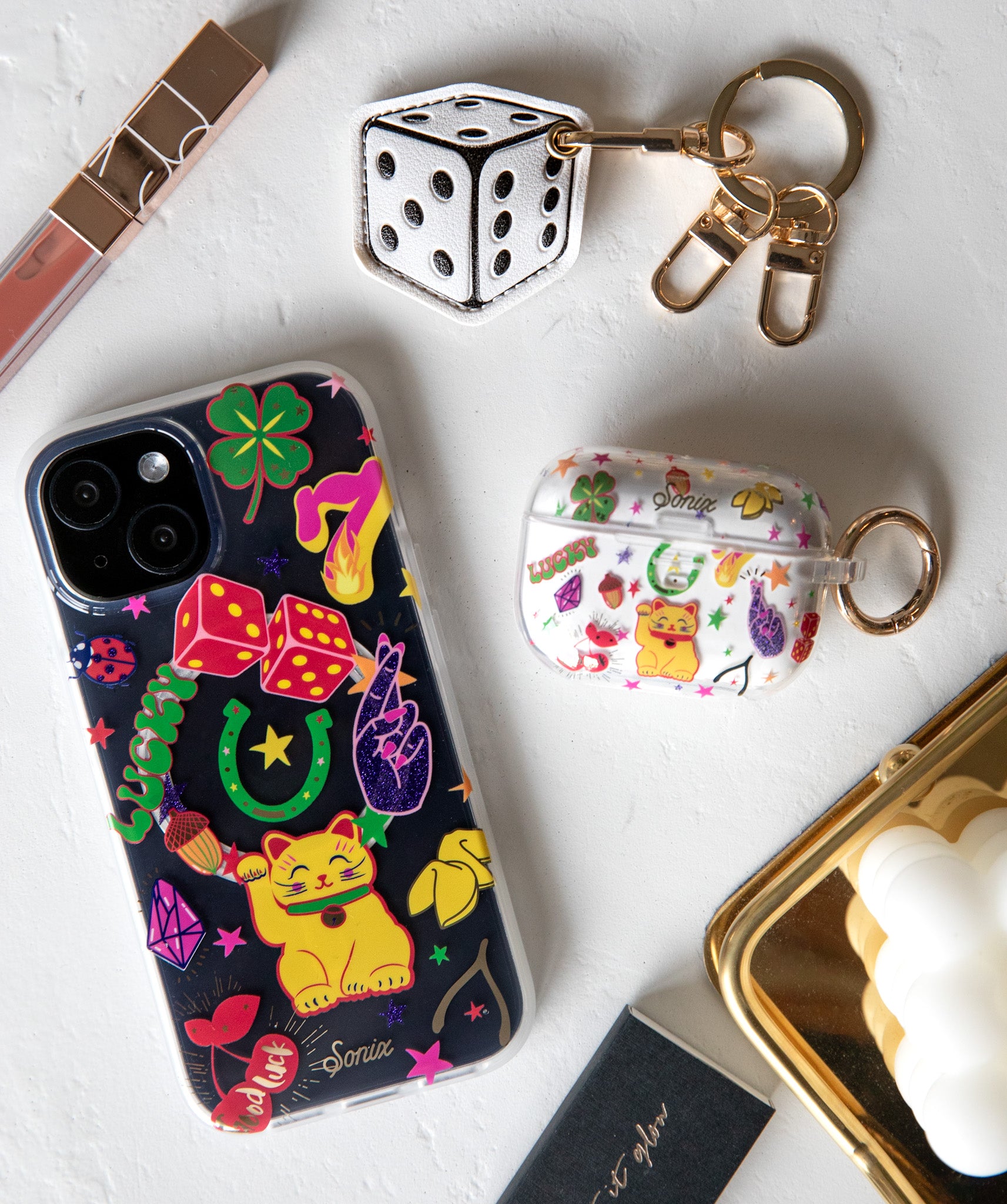 We want all the luck we can get for 2024. and this year calls for every tool in the box. We have pooled together all the ways to manifest good fortune. and we are already feeling the benefits of our new Lucky You Magsafe® Compatible iPhone case. With a clear protective background. this iPhone case showcases a colorful array of lucky tokens. The good fortune cat. wishbone. horseshoe. lucky dice. four leaf clover. number 7. fingers crossed. the fortune cookie: look we’ll take whatever we can get and we know a lot of you will too. Gold foil details round out this manifesting case since gold is always lucky to us. And. because even the most charmed people drop their phones. the Lucky You Case is made with the same drop-protection certification as every Sonix product.