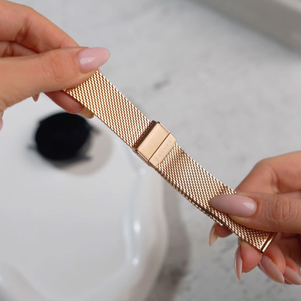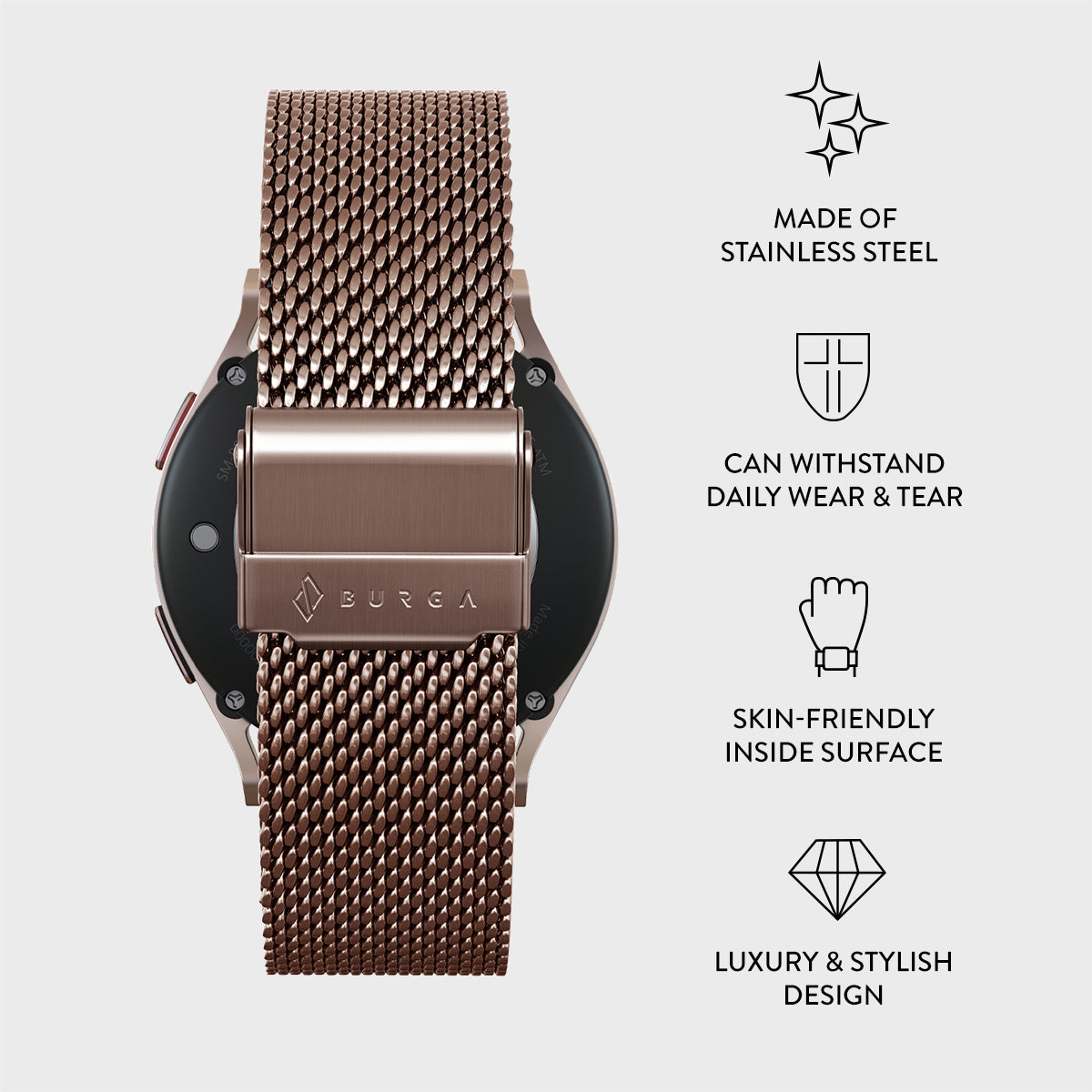 Bid farewell to discomfort. as our meticulously designed band boasts smooth. rounded edges and a featherlight touch for an always pleasant wear. The clasp has been ingeniously crafted to avoid any skin irritation. ensuring a snug. secure fit without the pinch.