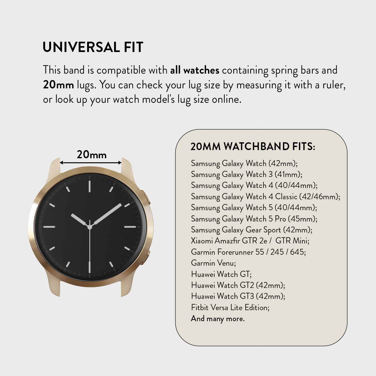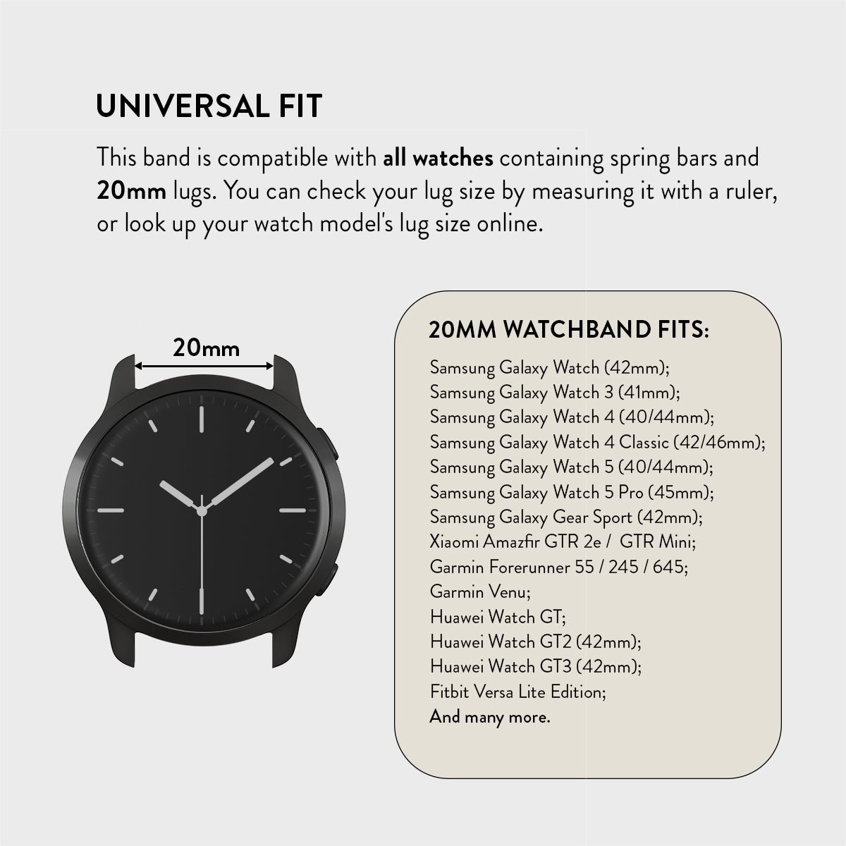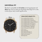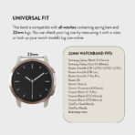 This versatile marvel seamlessly fits any 20mm or 22mm lug. including popular brands like Samsung. Garmin. or Fitbit. making it a universal statement of sophistication.