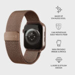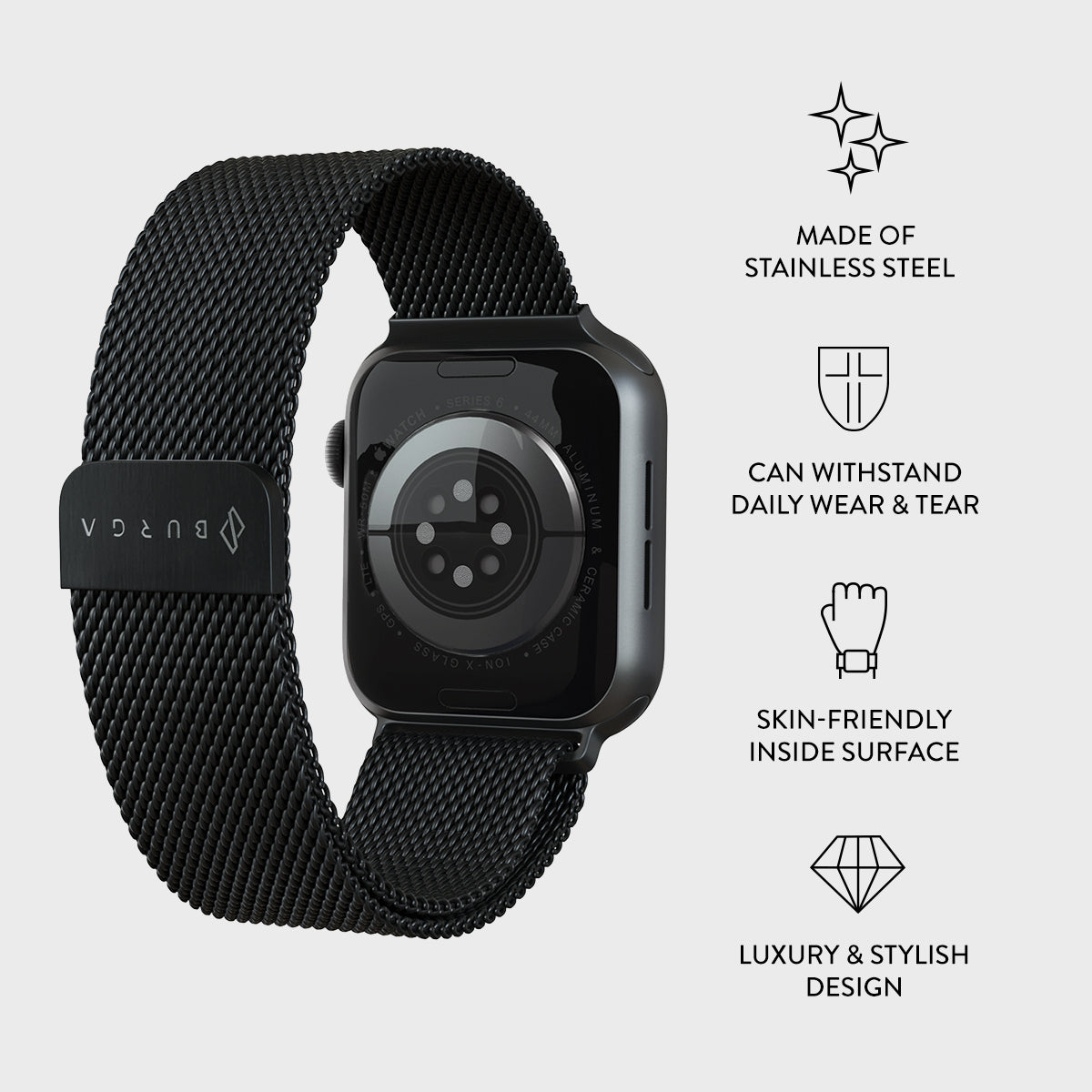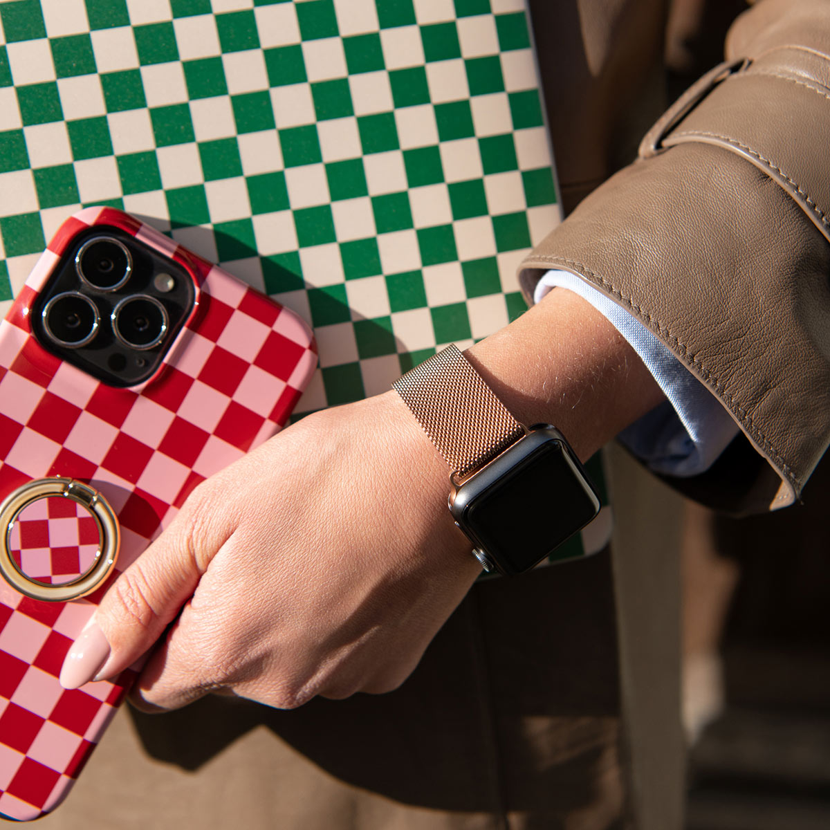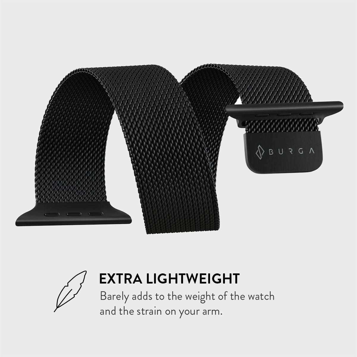Add a pinch of high-class to your Apple Watch experience with the sophisticated Milanese loop metal mesh apple watch band. The clasp-on magnetic buckle makes it incredibly easy to put on. And. unlike many similar bands. it stays on. Because it’s magnetic. the Milanese loop can be fully adjusted to your liking. ensuring a snug fit on any wrist. The mesh sits comfortably and doesn’t irritate the skin. Made for Apple Watch sizes 38-41mm and 42-49mm. Comes in Black. Silver. Gold. and Rose Gold.