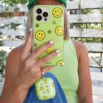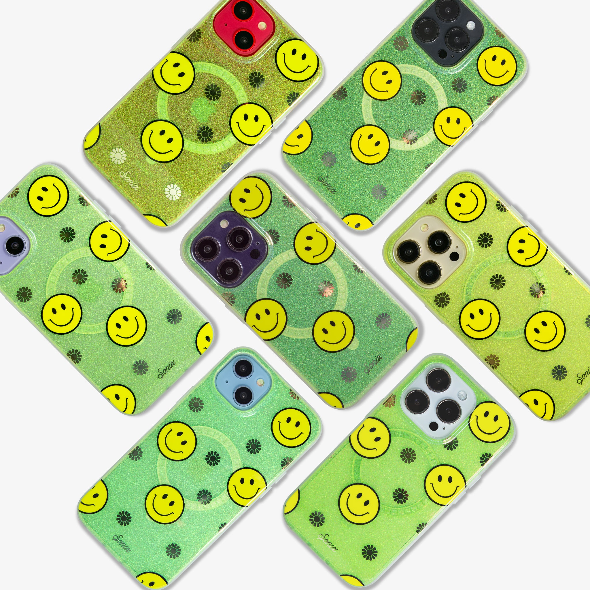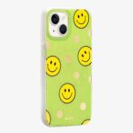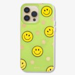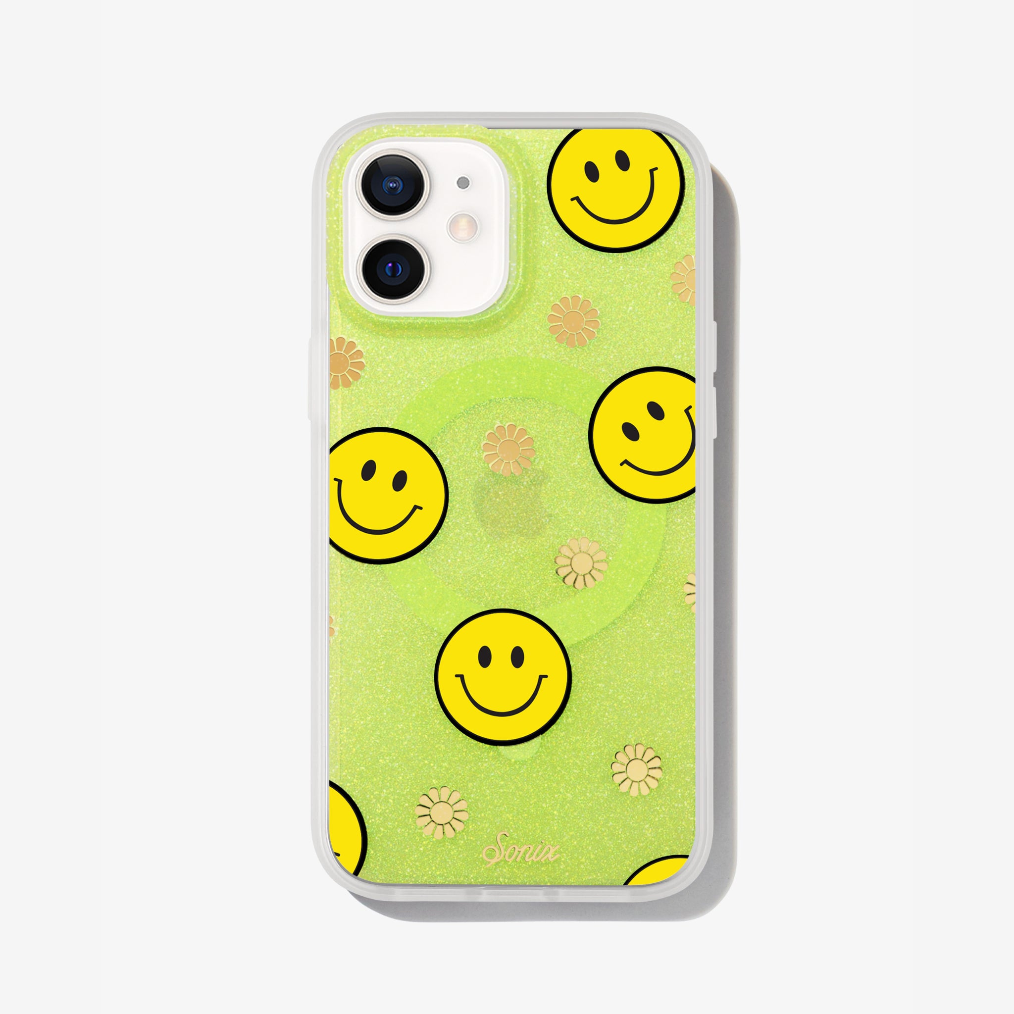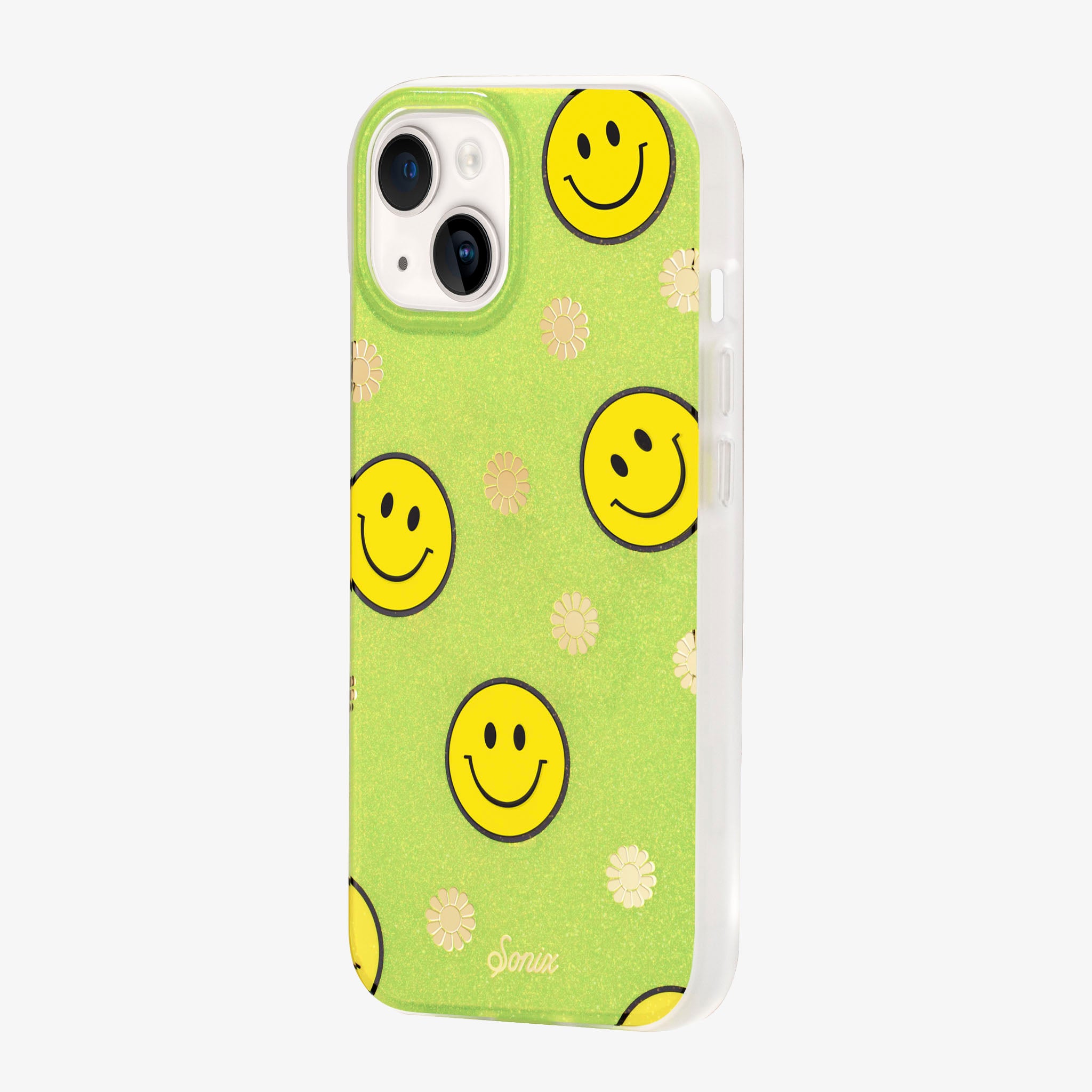 Our bright case will give you a reason to smile! The clear yellow case infused with iridescent glitter features happy faces and signature gold foil flowers.
