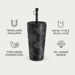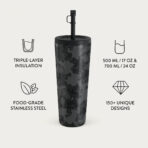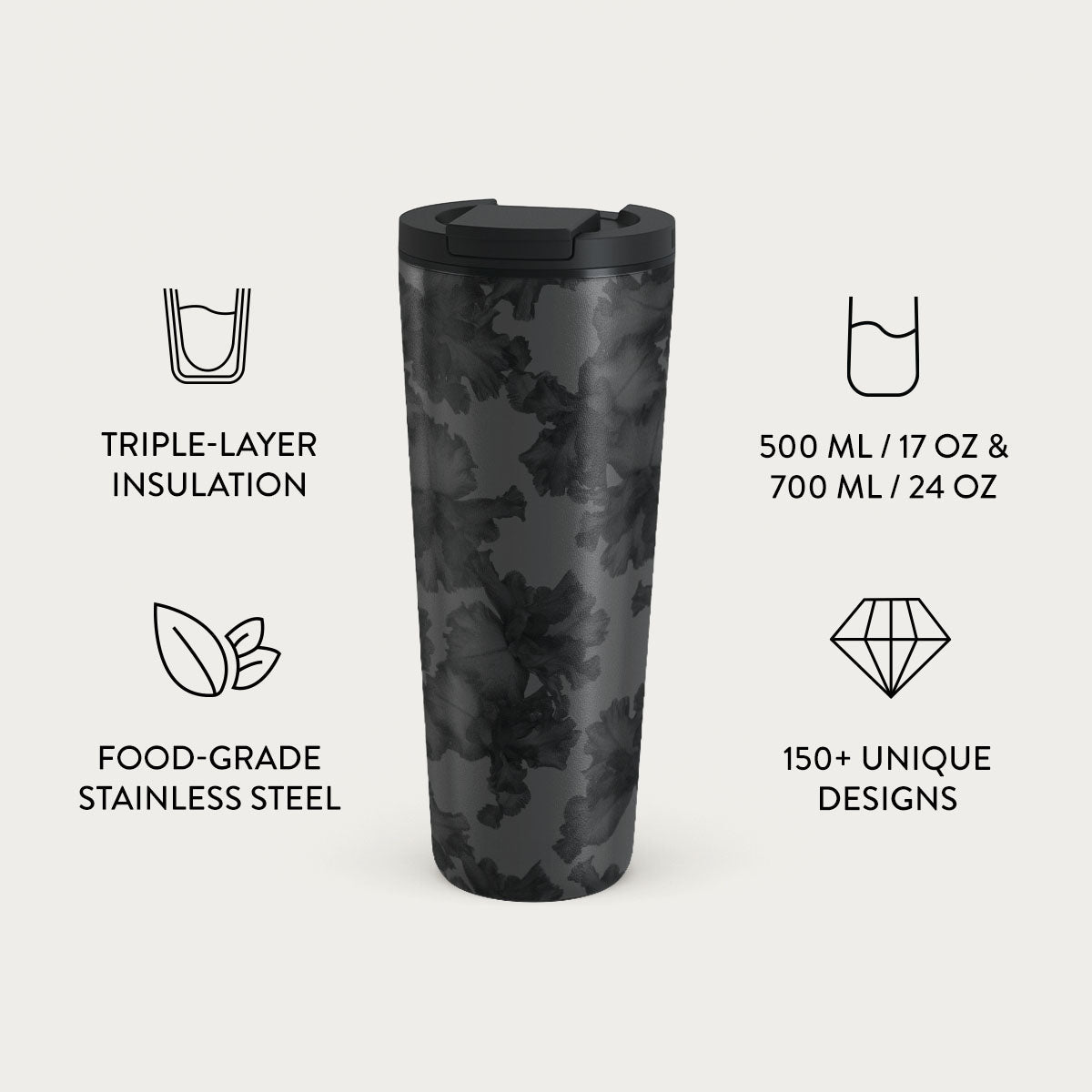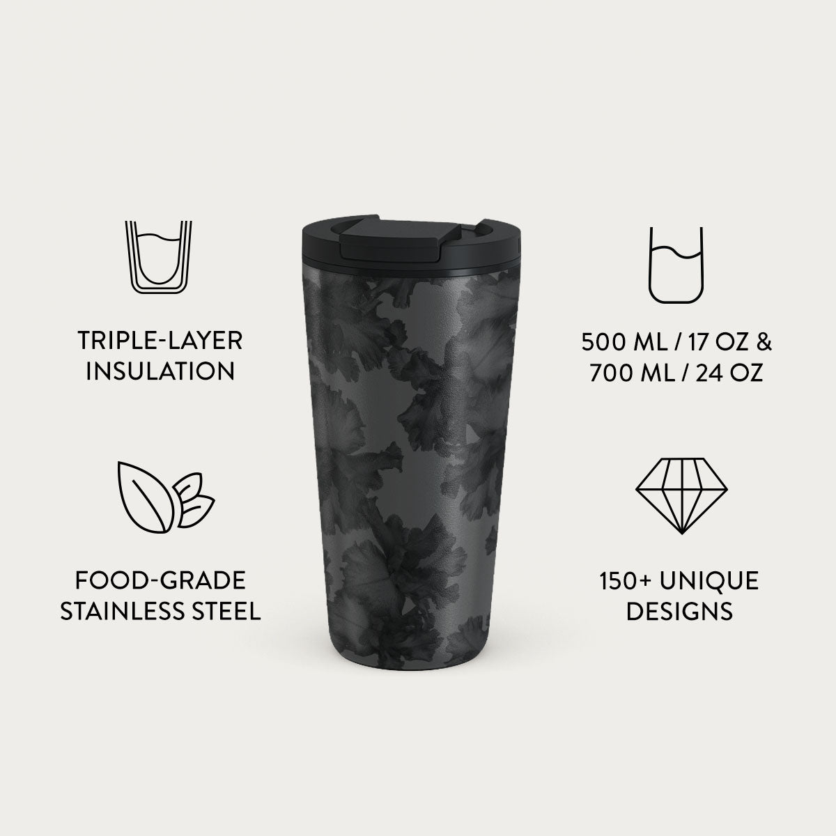 500 ml (17 oz.) Travel Mug: Keeps drinks hot for 6 hours. cold for 24 hours.