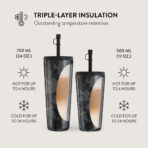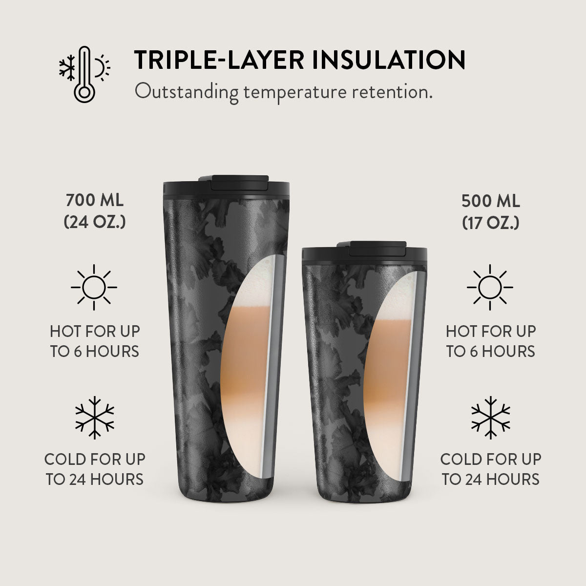 700 ml (24 oz.)Travel Mug: Keeps drinks hot for 6 hours. cold for 24 hours.