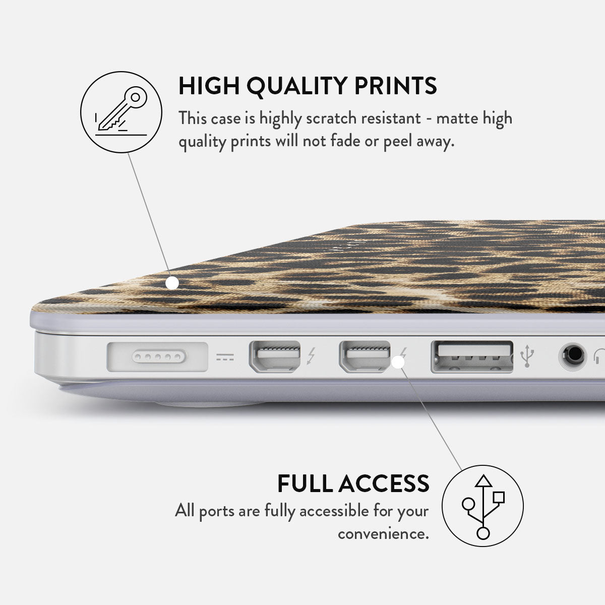 Either way. the BURGA MacBook case is the essential accessory for your everyday portable work-horse. It comes with two separate covers for the top and bottom of your laptop for that 360 protection. Despite this fact. it still maintains a slim profile and doesn’t make your MacBook feel bulky. The bottom cover also has a vent to keep your laptop from overheating when sitting. for example… well… on your lap! What else could you want from a MacBook cover? That’s right – easily accessible ports. Got that covered (or rather. NOT covered) as well.