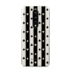This design features: black and white stripes. hearts. playing card suits. vintage style