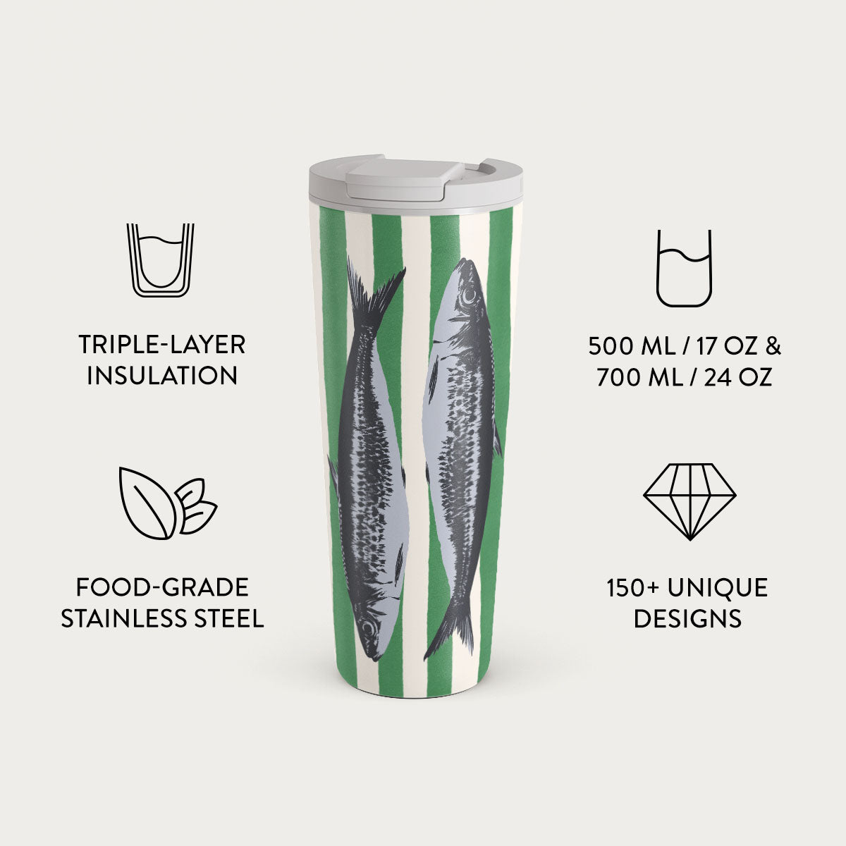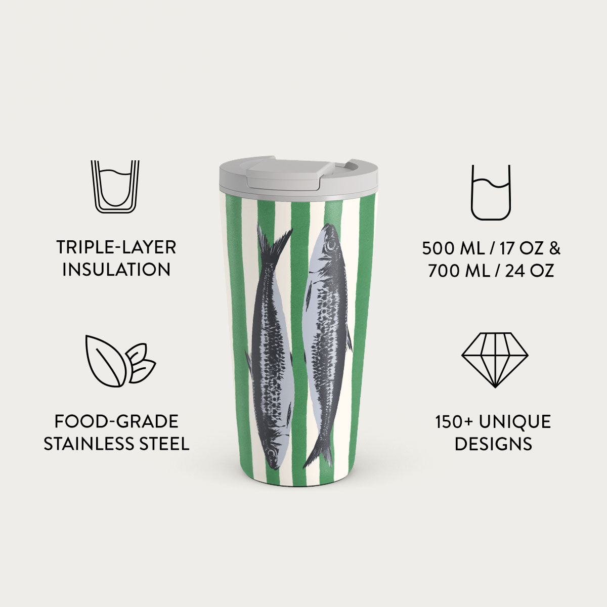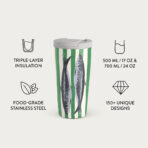 500 ml (17 oz.) Travel Mug: Keeps drinks hot for 6 hours. cold for 24 hours.