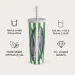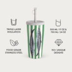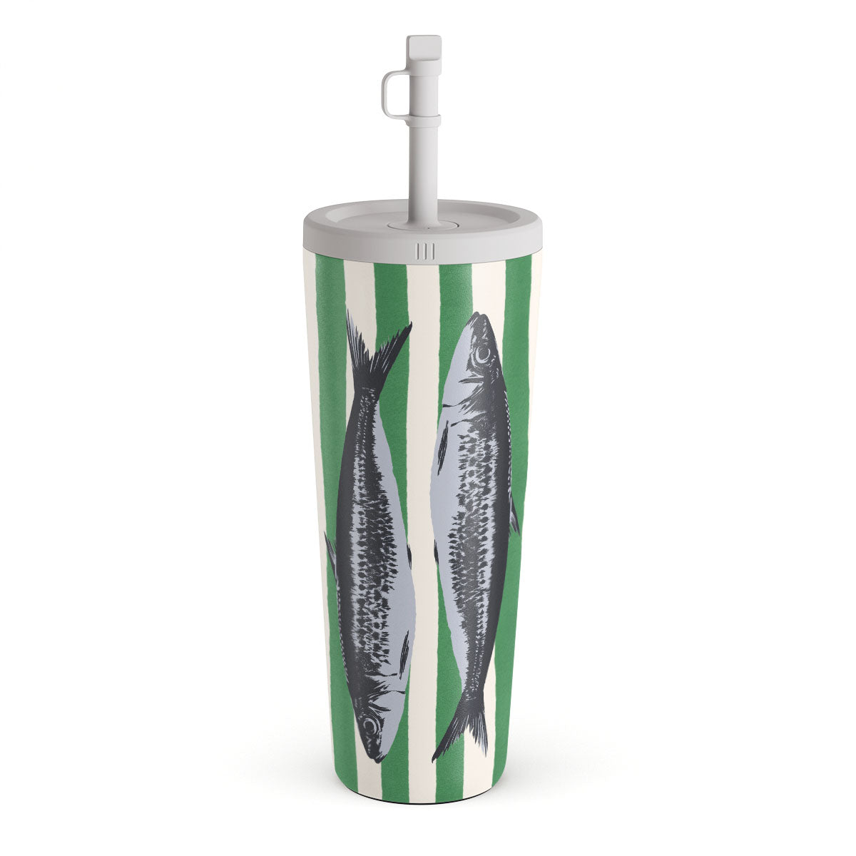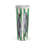 This design features: Sardines. green stripes. ocean motifs.