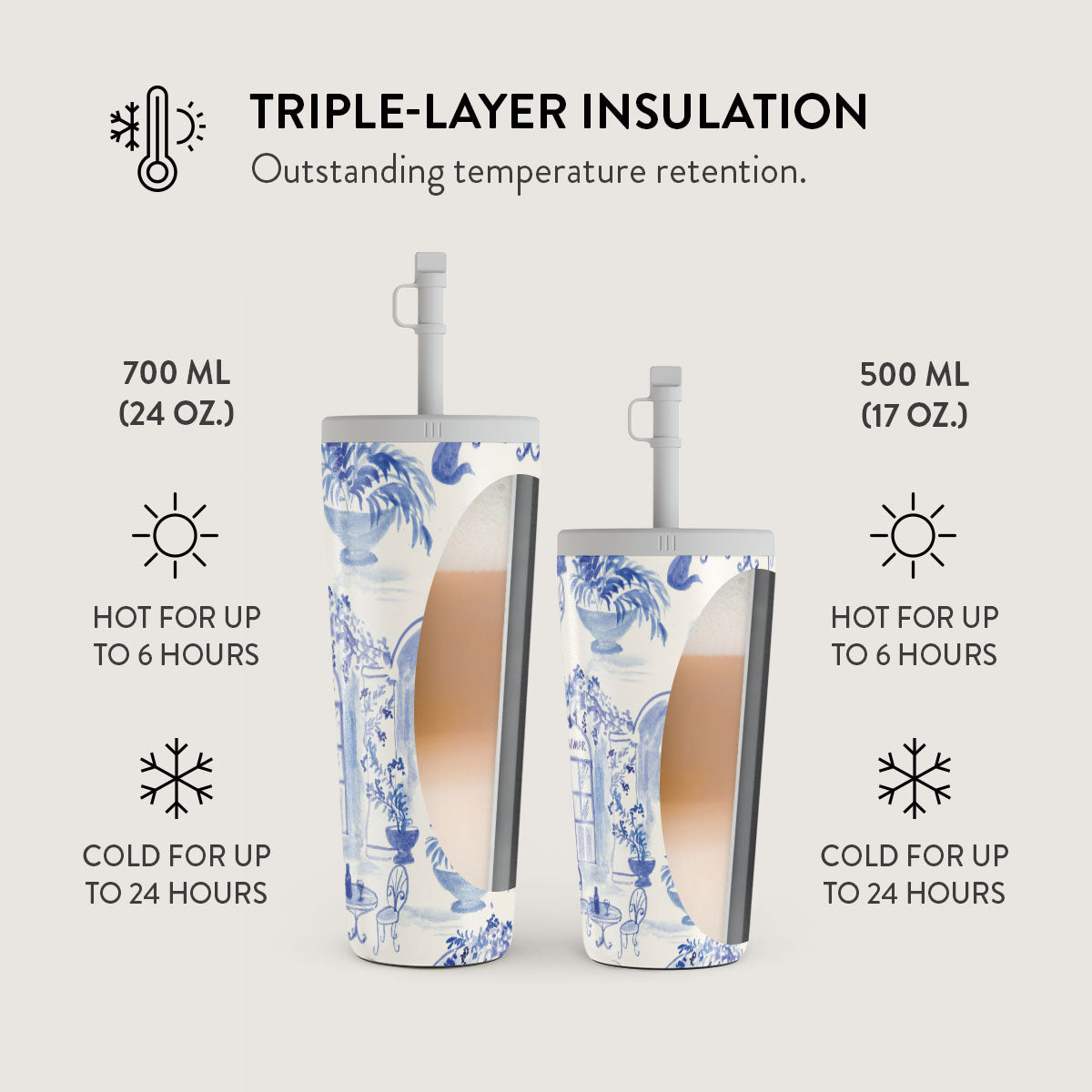 • 700 ml (24 oz.)Travel Mug: Keeps drinks hot for 6 hours. cold for 24 hours.