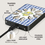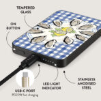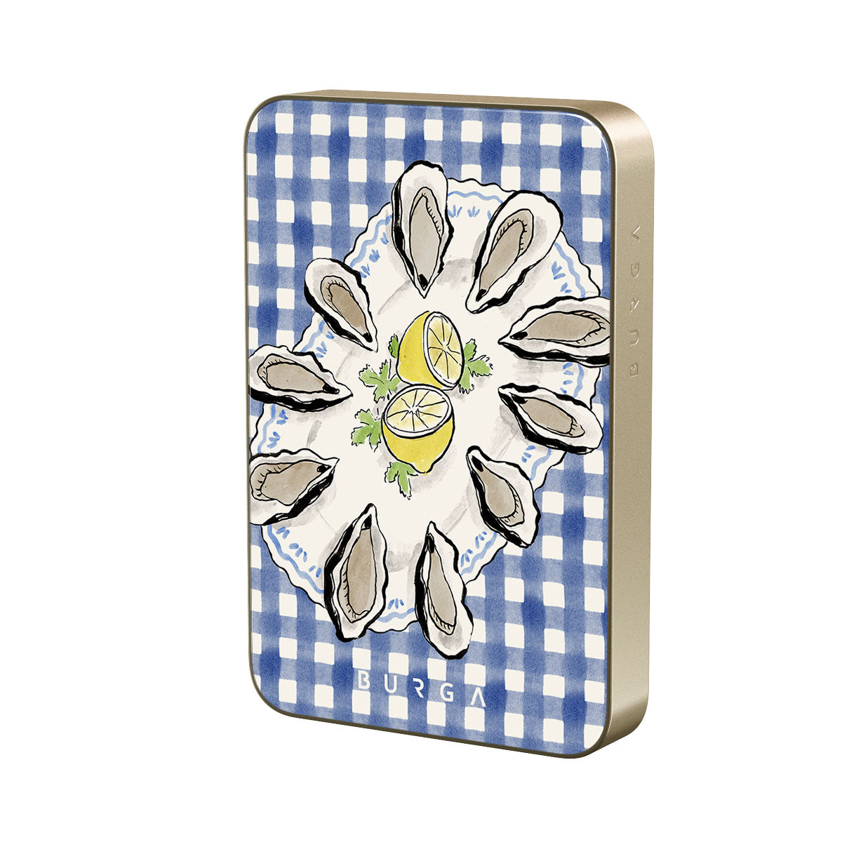 This design features: oysters. lemon. blue gingham. fresh coastal elements. soft pastel tones.